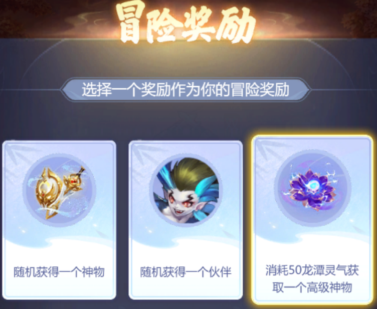贯彻整个共闯龙潭玩法的选择思路,骨妹建议是神物(高级>随机)>伙伴(星级>随机)>灵气>气血(安全屋除外。气血决定是否game over,需要留意)。