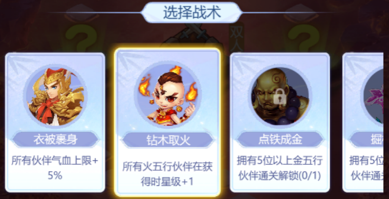 所以在开始时的战术选择,骨妹建议钻木取火(燃烧流争高分)和人多势众(伙伴星级较高)这两个战术。初期就先选择衣被裹身战术。
