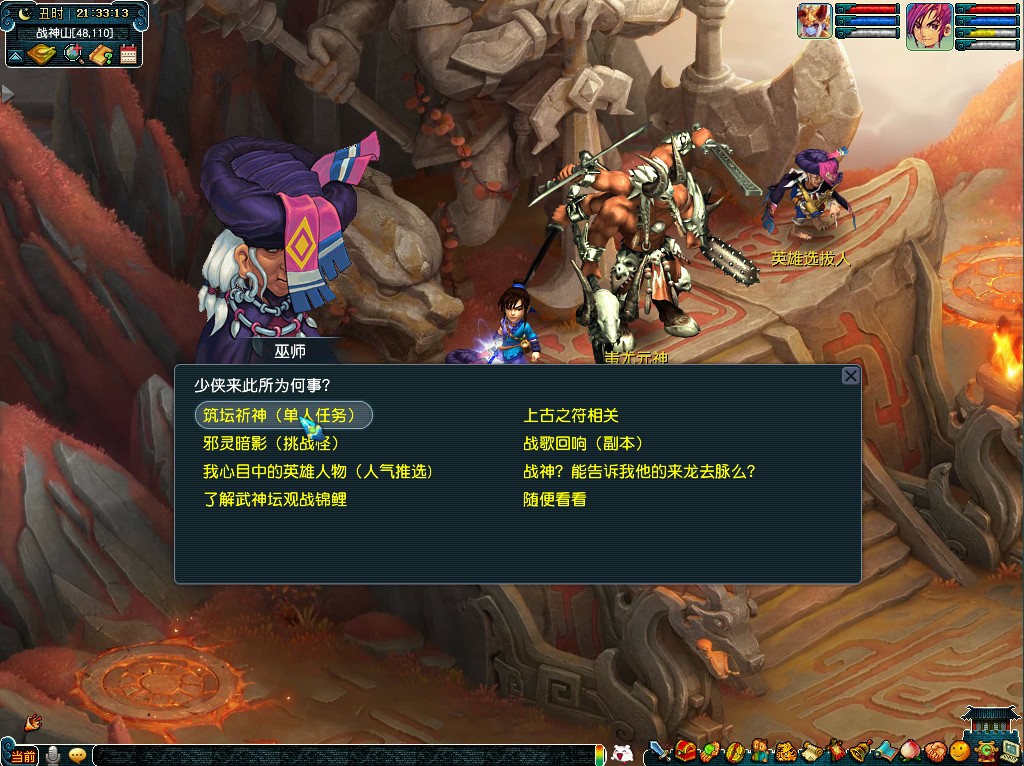 全服玩家可以通过完成“筑坛祈神”系列单人任务为本服务器做武神坛参战前后的人力物力储备,前往找到战神山(46,108)处的巫师即可领取系列任务。