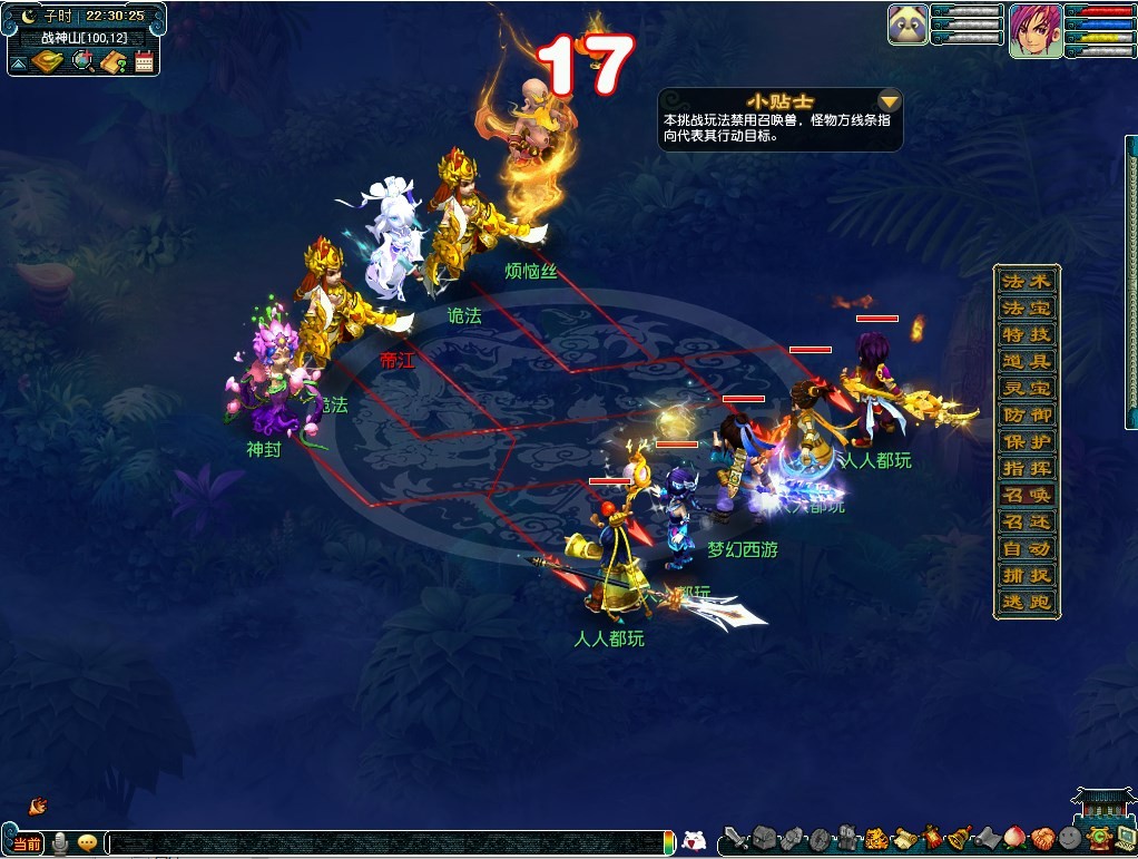 每月的第三周周一中午12:00至周五24:00,少侠们(≥50级,5人组队)可前往战神山(107,13)挑战邪灵蚩尤的魔神大将们,也可通过战神山巫师(46,108)寻路前往,每月将有不同的魔神暗影入侵战神山。