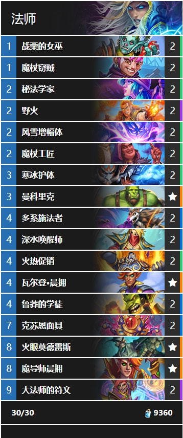 (注:卡组截图的中魔导师晨拥费用未更新,现应为7费;野火的费用未更新,现应为1费)