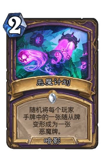 今天的主角——恶魔计划,这张卡在这个版本的作用有多大呢?其实他的效果是大于脏鼠的,比如说遇到任务体系的卡组的时候,人家好不容易做完任务,你把奖励给变了,这和脏鼠的性质不一样,脏鼠要是把他拉下来,场上多一个7/7的大爹一般来说我们的滋味是不好受的,比较本身现版本的任务体系的卡组做完任务我们的血量都不会太多,再来一个577吧,岂不是雪上加霜。还有就是可以变掉冰萨和法师的核心随从例如:雪落守护者或者巫师学徒。这张卡比脏鼠好的一点的是,脏鼠的拉出来的需要立马解掉而恶魔计划变的是在手牌中。