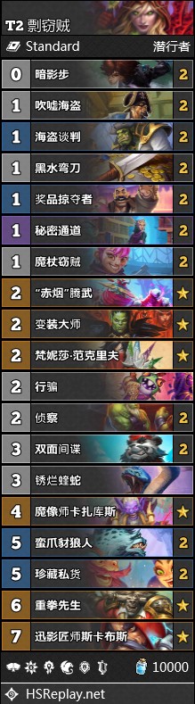 在目前otk卡组并不强势的天梯环境下,剽窃贼可以说是这次补丁的最大受益者,尤其在高分段热度极高并具有可观的胜率,在一定程度上定义了当前的天梯环境。剽窃贼是一套上下限非常高的节奏卡组,首先,双面间谍蛮爪豺狼人侦察珍藏私货以及英雄牌这五张新卡直接撑起了剽窃贼的核心强度,对于大多数对局而言,及早地打出双面间谍和蛮爪豺狼人便能够在前期取得一定的优势;其次是,剽窃贼可以根据对手卡组决定本局的整体思路是进攻还是防守,凭借侦察、魔杖窃贼、卡扎库斯等单卡优秀的“发现”机制使得剽窃贼在攻防两端都具有不俗的表现;最后是一些细节上的把握,例如注意资源和场面的分配、利用英雄卡的消失爆牌机制、用海盗谈判卡手牌术的疲劳伤害、注意暗影步会影响蛮爪豺狼人费用的bug等……我们本次推荐的剽窃贼卡组带上了重拳先生和赤烟腾武作为终结手段,针对牌的卡位依然是锈烂蝰蛇——针对刀贼和骑士的不二之选。