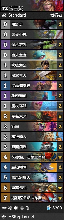 作为剽窃贼变种,宝宝贼带了很多0费牌用于触发范克里夫和霜狼,场面膨胀速度比剽窃贼更快,通常二费三费就有着让人看不懂的场面,但缺点就是够劲儿不足,如果没有通道,中期四五费几乎只能挂机,但有通道就有不断的节奏,比其他形态的贼的通道厉害的多。劣势对局可以考虑六七费暗影步回手范克里夫然后刷牌,大范的buff在手牌里也会保留,然后用于大范加重拳8费斩杀。拥有无限的可能性,但整体偏薄质量不足和吃牌序是对这套卡组的限制。