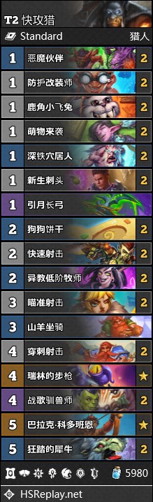 T7猎新版本的唯一补强穴居人也不出意外地被削弱了,但因为穴居人依旧能提供频率来蹭血,没有比它更好的一费随从了,所以构筑依旧不变,继续延用上一期的构筑。环境方面手牌术和决斗法的增多为t7猎提供了不少的食粮,但剽窃贼和宝宝贼高出场率限制了猎人的出场(啥职业都有可能是个贼)。