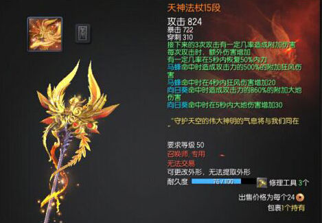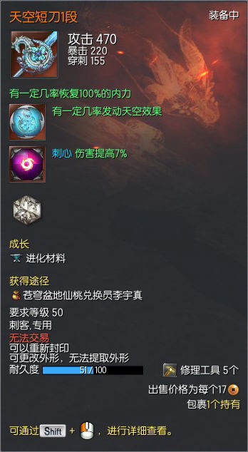 其中武器本身决定的是470攻击力,220暴击,155穿刺,和“有一定几率恢复100%的内力”;“天空元气石1段”决定的是“有一定几率发动天空效果”;“命运真气石1段决定的是“刺心伤害提高7%”,这三部分都可以独立成长,各部分所消耗的物资大约分别是之前一把完整的天空短刀的1/3。