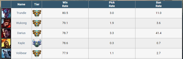 在目前的lolalytics的数据统计中,特朗德尔是唯一胜率超过80%的英雄,而他的选用率只有3%,禁用率则是11%,特朗德尔在克隆模式中并不是一个热门英雄。相比之下,亚索的登场率是7.8%,禁用率是41.7%,胜率也不过是60.8%;伊泽瑞尔、拉克丝和劫等英雄也是上场率高,但实际胜率很一般的英雄。