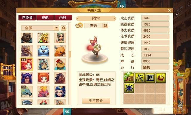 阿宝,出战等级55级,拥有5个天赋技能:高级敏捷、连击、独行、高级再生、土属性吸收,必带高级敏捷。