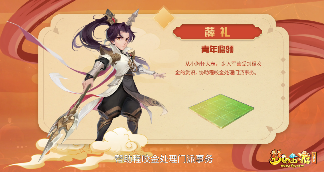 除此之外,大唐官府处还新增了一位重量级的NPC,唐朝名将——薛礼!从小就胸怀大志,踏入军营的薛礼,因为受到程咬金的赏识,被派来协助程咬金处理门派事务,这位NPC到底拥有哪些功能,目前还不得而知。