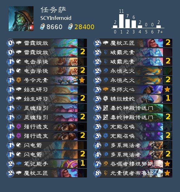 任务萨的构筑都大差不差,快速做完任务打出任务奖励之后用双倍速的法术特效战胜对手,既可以走直伤斩杀路线也可以走笔记能手+充能召唤站场获胜路线。一般研究这种框架稳定的卡组关注点是那些针对卡,蛇软用来针对骑士和盗贼,吃手手用来针对法师。原作者单独提到了英雄牌的重要性,他认为英雄牌打出的特效更稳定,后期变身回合可以奶11血(5甲+6血)包括召唤的两个嘲讽可以护脸,这点在面对海盗战猎人的时候显得尤为重要。还有一点就是笔记能手和魔杖工匠的卡位,这个贴出来的构筑是1笔记能手+2魔杖工匠也可以2笔记能手+单工匠。以我自己玩任务萨的体验来看,笔记能手不管是在前期刷过载法术做任务还是后期刷花呗配合解锁伤害都是很客观的,费用充足的任务萨是可以用一系列过载法术配合强行透支打出爆炸伤害的(特别是后期海还能用研习找法强)