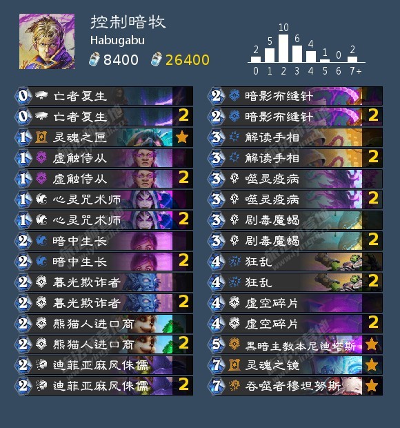 控制型的暗牧和快攻铺场的暗牧思路不完全一样,我觉得主要目标是吃一些中速卡组,这个构筑的暗牧要发挥出技能的优势,多用技能控场,后期可以用技能来补伤害,靠着牧师的一些随机衍生如熊猫人进口商和解读手相剧毒魔蝎这些牌发现额外的资源获胜。卡组里带的法术都是暗影派系的法术,可以触发暗影布缝针和迪菲亚麻风侏儒的特效。