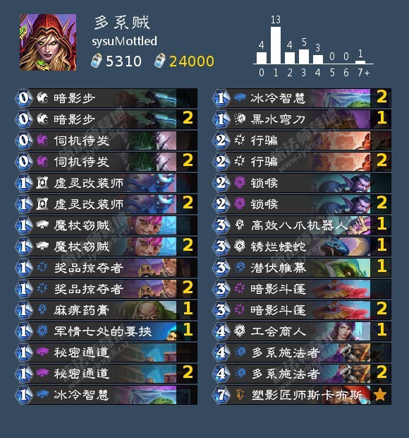 这套牌的法术派系有:暗影(暗影步,暗影斗篷)自然(麻痹药膏)冰霜(冰冷智慧),基础是过三张,魔杖窃贼还可以发现法师的火焰和奥术派系的法术。加上可以用暗影步回手多系施法者,搭配上盗贼本来就有通道和行骗这样优质的过牌,可以快速过穿牌库,条条大路通罗马,和之前锁喉贼有异曲同工之处。其他卡就是一些苟活牌,两张暗影斗篷+一张英雄牌可以提供三个回合数,前期奖品掠夺者和冰冷智慧是解场效率很高的牌。