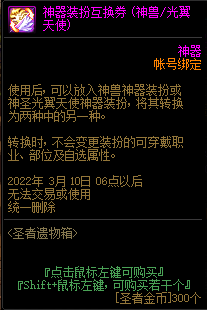 DNF神器装扮互换券使用后,可以放入神兽神器装扮或神圣光翼天使神器装扮,将其转换为两种中的另一种,转换时,不会变更装扮的可穿戴职业、部位及自选属性。