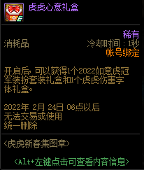 DNF虎虎心意礼盒开启后,可以获得1个2022如意虎冠军装扮套装礼盒和1个虎虎伤害字体礼盒,2022年2月24日06点以后无法交易或使用,统一删除。