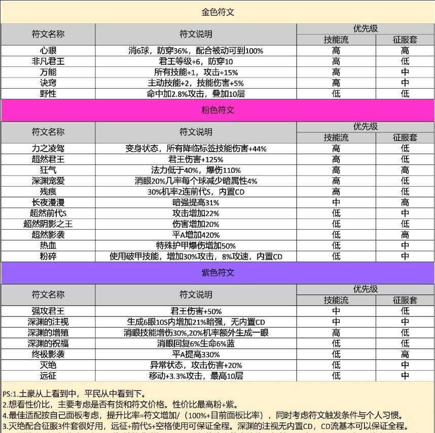 上面符文分了技能流 和 平A流,对应装备是:信使套+暗套和征服套!