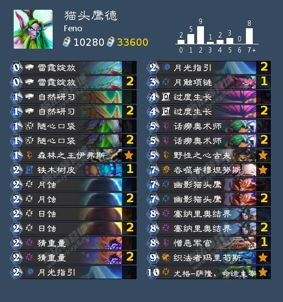猫头鹰德的玩法和之前一样,快速跳费后用织法者玛里苟斯拉满手牌资源,用日蚀+结界,猫头鹰连续铺场压死对手。现在猫头鹰的后期质量用随心口袋+月光指引就可以拉满,所以放弃了树木生长。