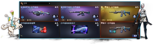 白马银枪系列是一个全新的主题系列,目前问世的道具包括冰龙粉碎者-白马银枪、御·黑骑士-白马银枪、黑骑士-白马银枪皮肤、白马银枪套装名片喷图和激光毁灭者III-白马银枪。后期是否有更多延伸道具,值得期待!