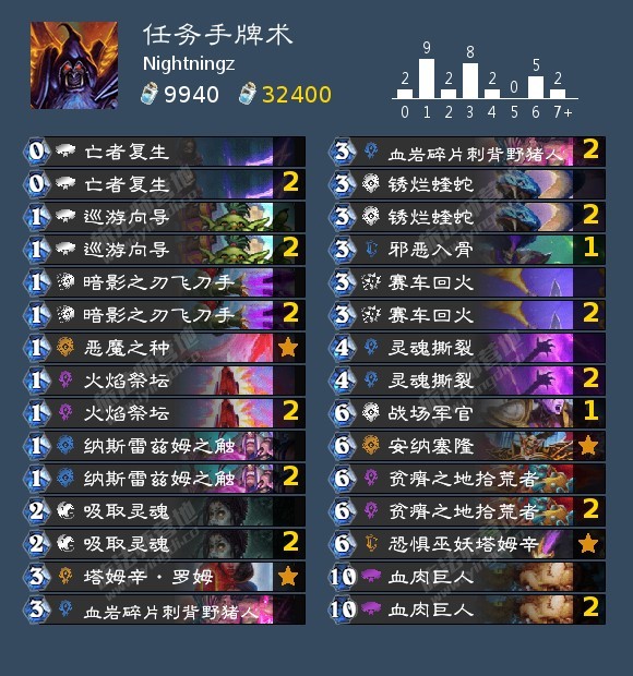 任务手牌术是一套体系成熟的卡组,这套术士的核心体系还是围绕巨人+撕牌体系构筑的,现在主要对手是盗贼,所以重新带回了两个灵魂撕裂中期解场。其他构筑亮点就是带了两个蛇软吃刀,本身的交易属性对术士来说也不错。单独带的邪恶入骨前期有机会打5解一个豺狼人(不过这个情况有点理想,可能还要配合下小解牌和其他牌)中期可以6费打10才是这张牌解场效率不错的时候。