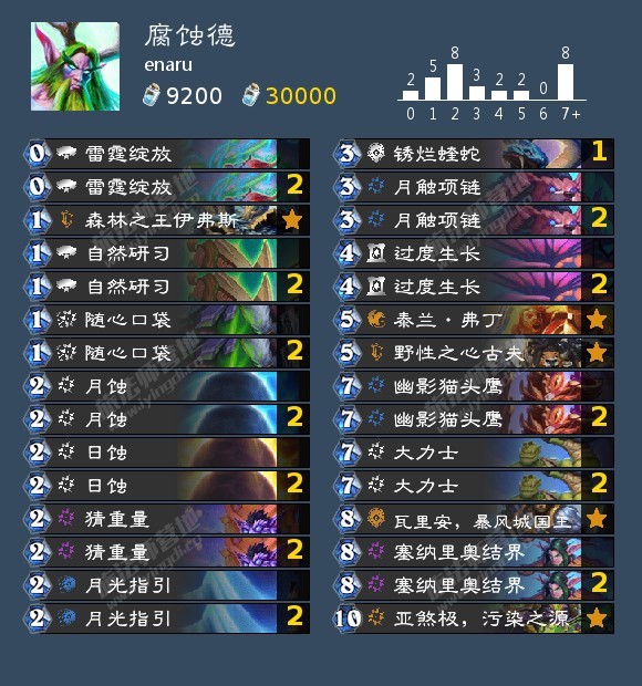 构筑上大差不差的一套腐蚀德。原作者强调了他卡组的创新是带了8费的瓦王来提高卡组的中期节奏,为了配合瓦王选择带上了泰兰佛丁,这样泰兰佛丁可以定向检索亚煞极,瓦王又可以检索佛丁,猫头鹰和大力士。而且佛丁本身是一张还不错的五费可以裸拍的曲线生物,还可以腐蚀月触项链。(我自己玩的腐蚀德八费是带飞火箭的斯尼德的,大家可以都试试)腐蚀德的玩法不变,留古夫和科技牌,跳起费用后用日蚀结界或者日蚀口袋找额外资源获胜。现在这个节点都是成型卡组上的小修小改了。