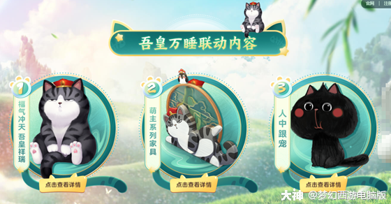 联动萌虎吾皇,畅玩梦幻三界!《梦幻西游》电脑版与吾皇猫共同推出的联动活动即将于本月25日全服上线。当大家进入游戏后,不仅可以在梦幻三界遇见这只极具人气的萌宠“吾皇”,而且还能将其作为自己的坐骑祥瑞,带着“吾皇”四处游玩。相信在这只全新萌宠的陪伴下,大家定会收获无限欢乐,在梦幻三界中留下更多难忘的回忆!