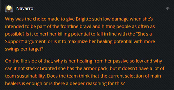 另一方面,为什么布丽吉塔的被动治疗这么低,而且不能叠加治疗?当然,她的护甲包起了一定的作用,但是这并没有给团队带来跟多的持续性治疗。开发团队认为目前的支援英雄是否已经够用,或者有别的更深层次的原因吗?