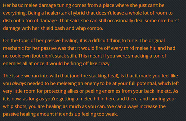 至于她的被动治疗,调整起来是一件非常困难的事情。她的原始被动机制是每三次近战命中就会触发一次,并且没有冷却时间(但是没有叠加)。这意味着如果玩家一下子击中大量的敌人,被动治疗就会被频繁地触发。