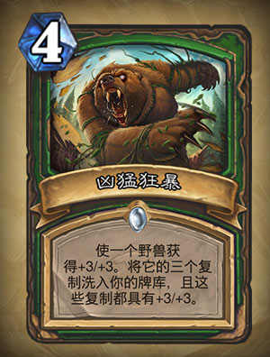 凶猛狂暴:这张牌的机制非常有趣,有很大的操作空间——但又并非明面上的超模。首先它只能对野兽使用;其次它复制的随从会被洗入牌库,因此需要较长的对局才能获得更多收益。如果复制的经常是1费随从的话,可以带5费35定向检索;如果复制的经常是大随从的话,卡瑟娜·冬灵则可能把他们拉出来。追踪术也能帮助检索被Buff的随从;但缝合追踪者不行(因为他是将该随从复制并加入手牌,并不会保留Buff)。