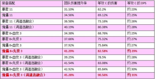 表格中,“等效C的伤害”意为将巨龙的团队伤害提升率等效为一个C的伤害量,其确切描述应为“等效于队内2个C的平均伤害的百分之X%”,这主要是为了方便与3C阵容中的第三个C进行对比。
