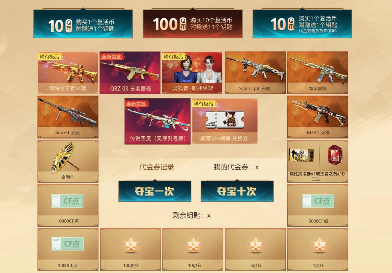 2、购买:10Q币购买复活币1个并赠送1把钥匙,100Q币购买复活币10个并赠送11把钥匙;拥有代金券的玩家,可以使用代金券抵扣购买复活币并赠送钥匙,一次最多抵扣9个代金券,一旦代金券使用后无法退还(下单后未支付,订单被系统取消之后或手动取消之后会返还抵扣的代金券);若玩家账号被封号则不允许进行充值行为,请玩家在解除封号后进行充值。