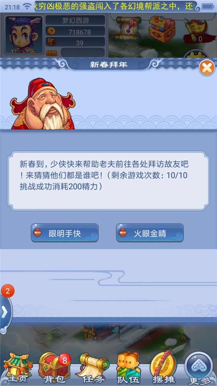 活动期间,侠士点击首页上方卷轴中的“新春拜年”图标即可进入新春拜年玩法界面。侠士根据阴影形状选择出正确的拜年对象即可完成任务。每天最多获得10次奖励,每次消耗200精力,必定获得经验、储备金,还有机会额外获得五宝、魔兽要诀等物品奖励。