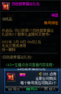 DNF四色徽章幸运礼包开启后,可以获得1个四色徽章福运礼袋和3个徽章礼盒随机变更券,四色徽章福运礼袋可以随机开出徽章礼盒,使用徽章礼盒变更券可以变换礼盒。
