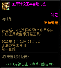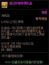 DNF喜迎新春特别礼盒开启后,可以获得1个威风虎冠军披风礼盒、1个威风虎冠军腰带礼盒、1张小黑虎卡片和1个金库升级工具自选礼盒。金库升级就是账号仓库或者个人仓库二选一。