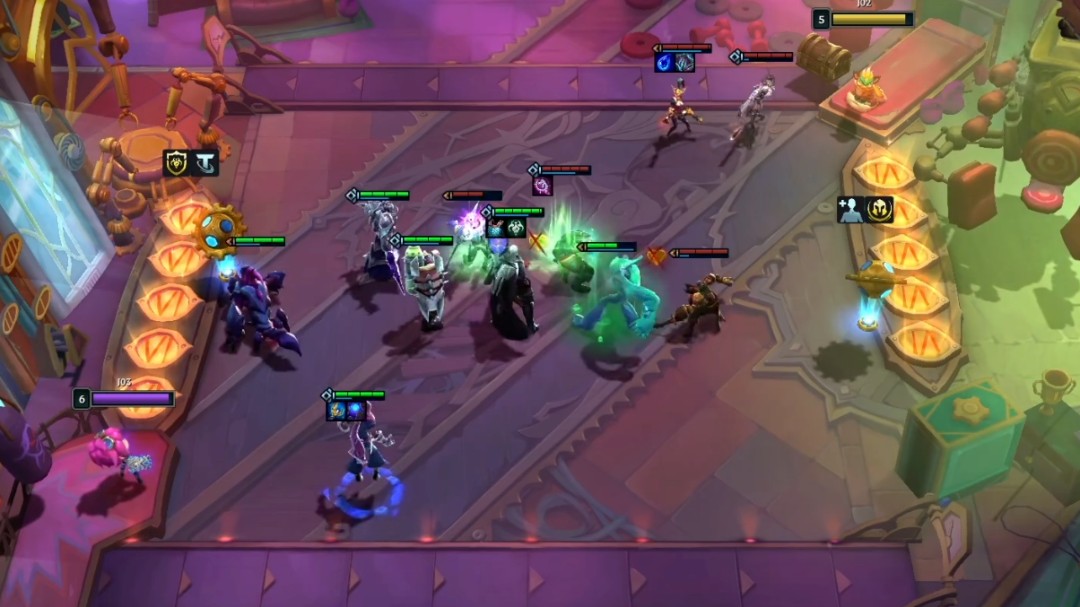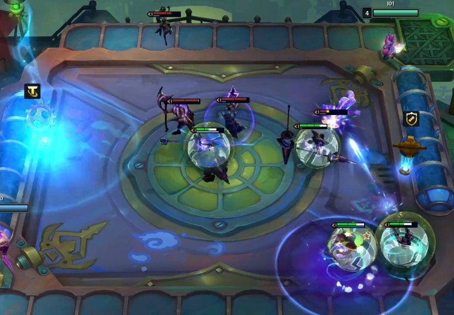 海克斯羁绊已出现成员:牛头,梦魇,猪妹和皇子,每隔几秒就会释放一次冲击波,此外对面那个棋子看起来很像辛德拉。