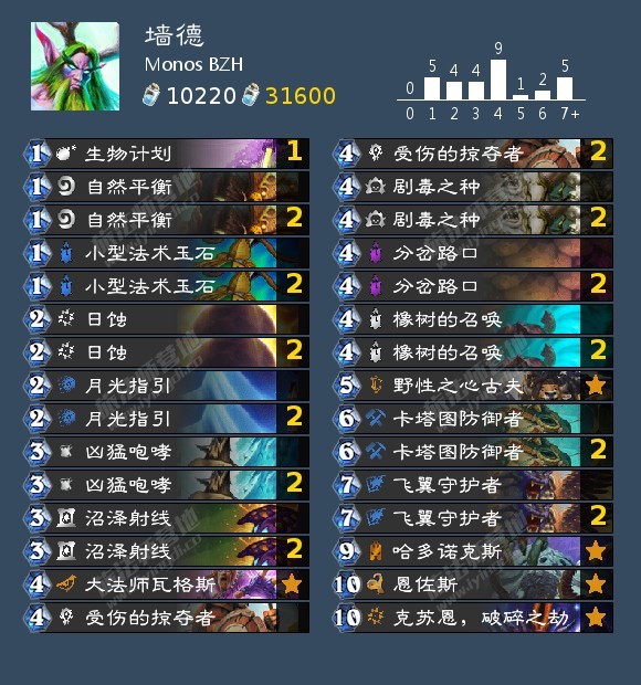 自女巫森林后,墙德就作为一套完全成体系的卡组一直存活着。如今作为Monos BZH口中最大天敌点燃走远,狂野整体回合数更缓慢,墙德或许将有更大的舞台。他这一版的墙德更像是拥有进攻手段的碎克防德,嘲讽随从的质量也非常扎实,期待补丁后的表现。