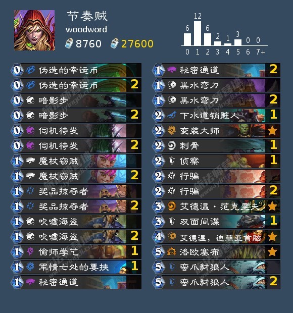 卡组打法很灵活,有双范可造,也能用小随从在前期蹭血,中期塞布叫杀,暗影步相当关键。