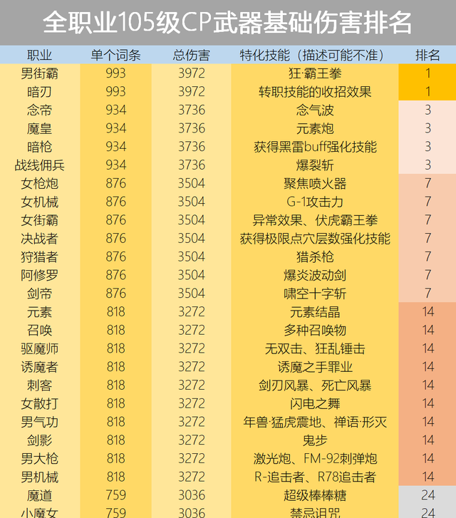 可是千万别忽略了一点,每个职业换取强化技能的所用伤害不同!举个例子,如果武器少了一半伤害,换来特定技能的50%增伤,变强了吗?说不准吧,但一些职业只用5%的伤害换来1个小技能的优化,没准实战还有奇效。因此小编制作了105级CP武器的伤害排名,并且对应每个职业的特化技能。