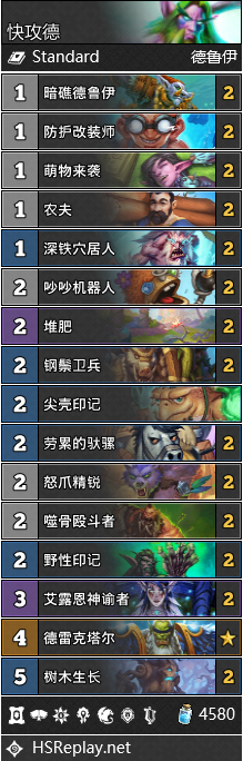 快攻德也很强势。类似于野兽德,快攻德也靠着抓跳费德赚了不少分。快攻德打不过那些有强AOE能力的卡组,所以除了抓跳费德之外,快攻德的主要食粮是像快攻猎这样的卡组。