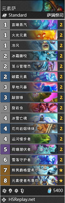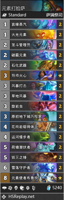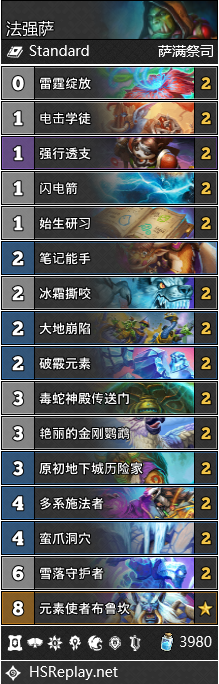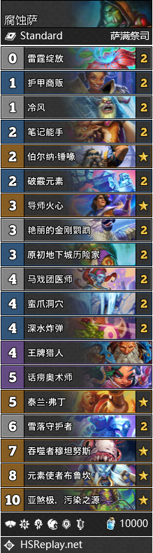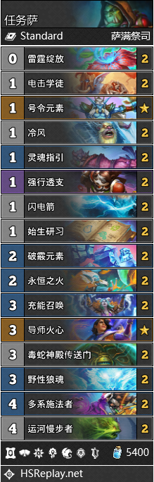任务萨应该是目前整体表现最优的萨满卡组。他的适应面很广,唯独打不过手牌术以及“自闭型”直伤卡组(这些卡组在传说高分段较为多见)。除非你能瞬间铺出超出永火射程的大个随从,否则很难凭借场面压死任务萨。下面这套搬运的任务萨可谓是补丁后的完美构筑了。运河慢步者是一定要带的,它几乎在所有分段都能派上用场。