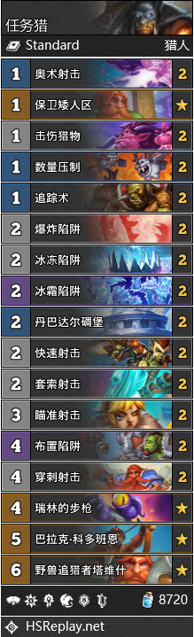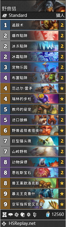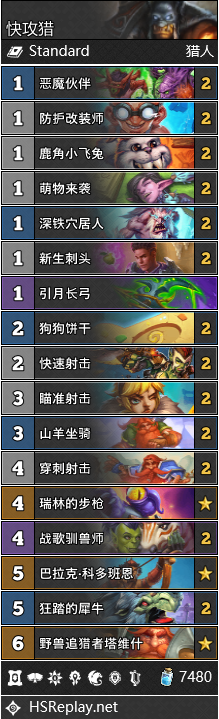 快攻猎依然强势,而且也能够有效反制手牌术。只不过螳螂捕蝉,黄雀在后。高分段的环境中反倒是有更多能够克制快攻猎的卡组,比如暗牧,邪能瞎,甚至防战。