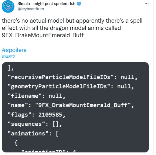 这组文件中还有5个使用了 "9fx_drakemountemerald_buff "法术效果的纹理,可能与这组文件中的一个加密坐骑有关。这个法术效果是在9.2补丁中加入的,这个效果的字面意思是”BUFF:骑乘着翡翠龙。”由数据挖掘者Simaia发现,典藏版的坐骑通常与资料片主题相关联。