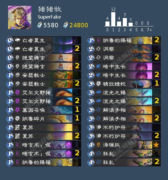 新卡暗言术噬可以用来解掉自己场上的野猪来触发亡语,其他牌诸如泽瑞拉,狂乱都是解牌,这个卡组的关键就是KEY牌怎么上手和牌序问题。