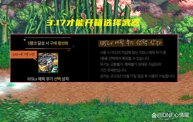 【2】3.17版本才能打开。即便你兑换了105级史诗武器自选箱子,但“尹明镇”老谋深算,给玩家制定规则,3.17才能够打开。为什么这样?其实很简单,韩服3.17重磅推出110级版本,武器不能超前,这也是可以理解的。