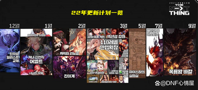 2月男弹药和气功重做,“真·异界”地下城登场,一切都在更新计划当中。接下来“尹明镇”,会按照所公布的日程,内容逐步的亮相出来。3.17等级扩展,110级版本登场,全新装备和副本推出。而5月“七战神实验室”降临,特殊的地下城副本,7月军团地下城,9月巴卡尔攻坚战。