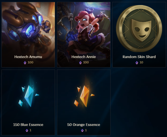 4、之前说的是神话精粹可以兑换海克斯宝箱,不过实际上线后变成了随机皮肤碎片(10神话精粹)