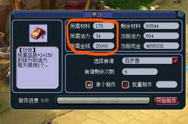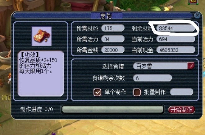 3、制作百岁香的NPC在朱紫国(49.41)选择"借厨房做烹饪"消耗175点材料值、活力与金钱制作。