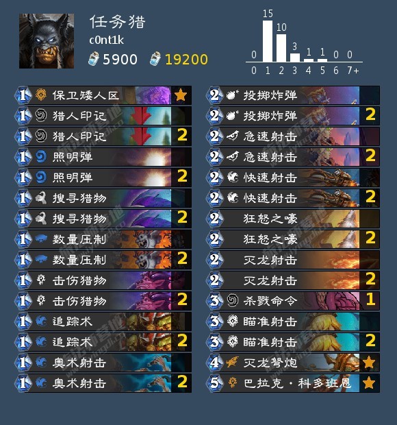 任务猎在迷你合集中收获了狂怒之嚎和灭龙射击两张新卡。前者的续航+后者荣誉击杀就能不断任务进度的做任务手段补充使得任务猎的强度直线上升,大有竞争T1卡组之势。在目前环境尚未出现法力长袍之时,任务猎具有巨大的环境优势,现存比较大的主流劣势对局是德鲁伊,卡组能够与术士竞速,并且偏慢速的德鲁伊稍有卡手或运营不慎也会有翻车的可能性。巴拉克·科多班恩是可以被放弃的卡牌,5费太高,容易卡住狂怒之嚎。可以酌情选择猎人的2费法术小AOE来提升快攻抗性。