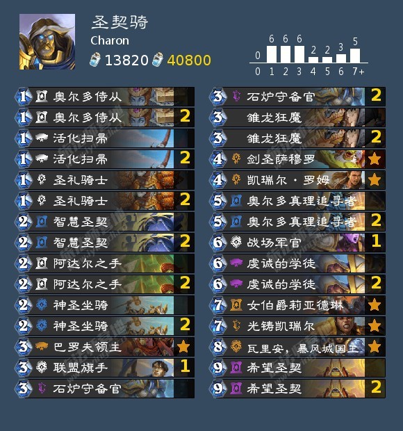 中规中矩的一套圣契骑,带了新卡雏龙狂魔,因为骑士前期有6张低费的buff牌,容易触发荣誉消灭,过一张牌对于骑士来说效果还算不错(主要是这张牌5血,贴个buff前期还挺能混?)