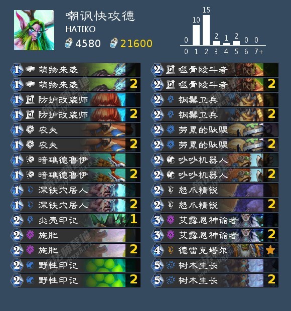 一套嘲讽体系的快攻德,前期围绕钢鬃卫兵的减费展开,前期配合噬骨殴斗者和劳累的驮骡可以快速展开场面,四费的德雷卡塔尔也可以在中期提高卡组上限快速展开。铺开场面之后可以用树木生长怒爪精锐。前期的节奏还可以靠buff一个深铁穴居人干扰对手,制造足够的频率前期快速抢血。