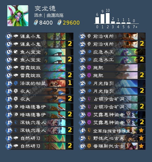 一套比较有趣的卡组,卡组的核心思路是围绕普瑞斯托女士展开的,德卡组的构筑优势是占领冷齿矿洞可以稳定检索普瑞斯托女士,增加了卡组胡的上限。全部变龙之后因为卡组带了很多低费牌,可以打出较高的上限,配合可能的三费的艾露恩神谕者复制场面。前期就当快攻德的玩法正常展开。古夫作为万金油单卡,既可以跳费加快节奏还可以中期过牌,德现在的卡组无法拒绝古夫这张强力的英雄牌。