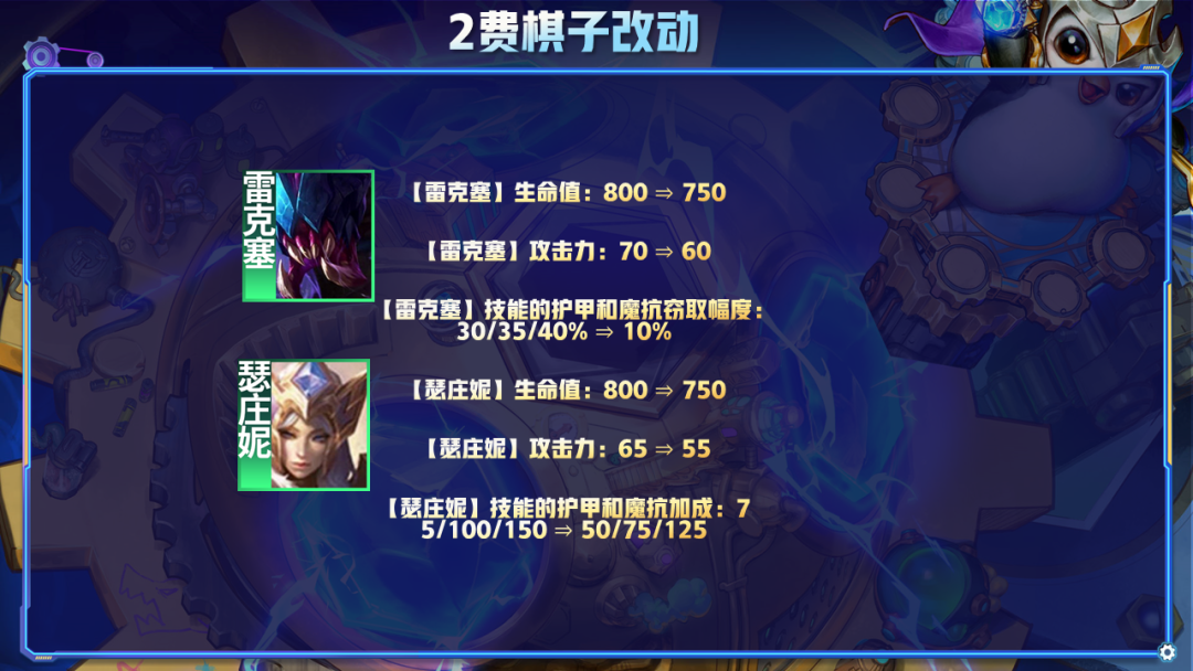 解析:雷克塞当初在测试服的时候就被砍过一刀了,不过当时砍的是法术加成,这次的话直接把他砍废了直接成为挂件,现在在任何体系内都不用追三星了,也不会成为主C了!猪妹的话确实该削,2费卡3个羁绊前期随意补个海克斯再搭个女警随意连胜!